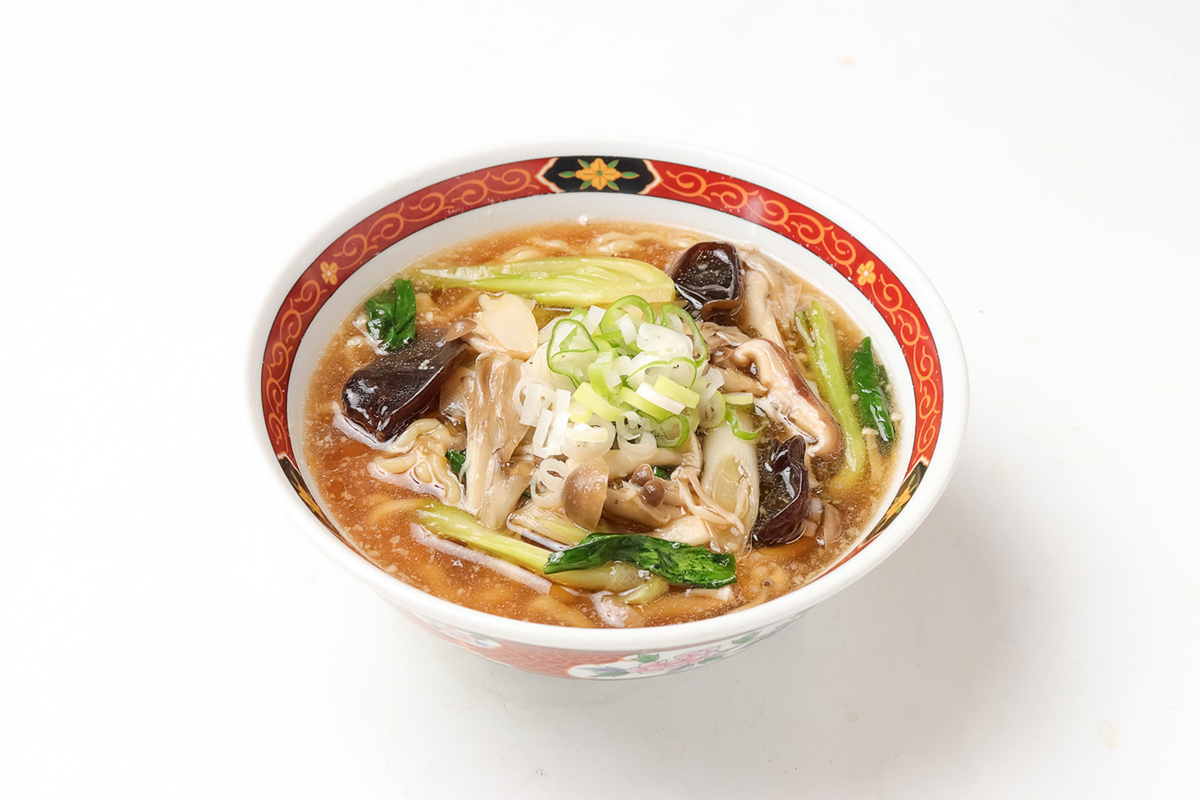 この新メニューは、豚と煮干しからとった澄んだ醤油スープに、舞茸・しいたけ・しめじ・えのき・きくらげの5種類のきのこと野菜をトロリとした餡でまとめて、あんかけにしています。