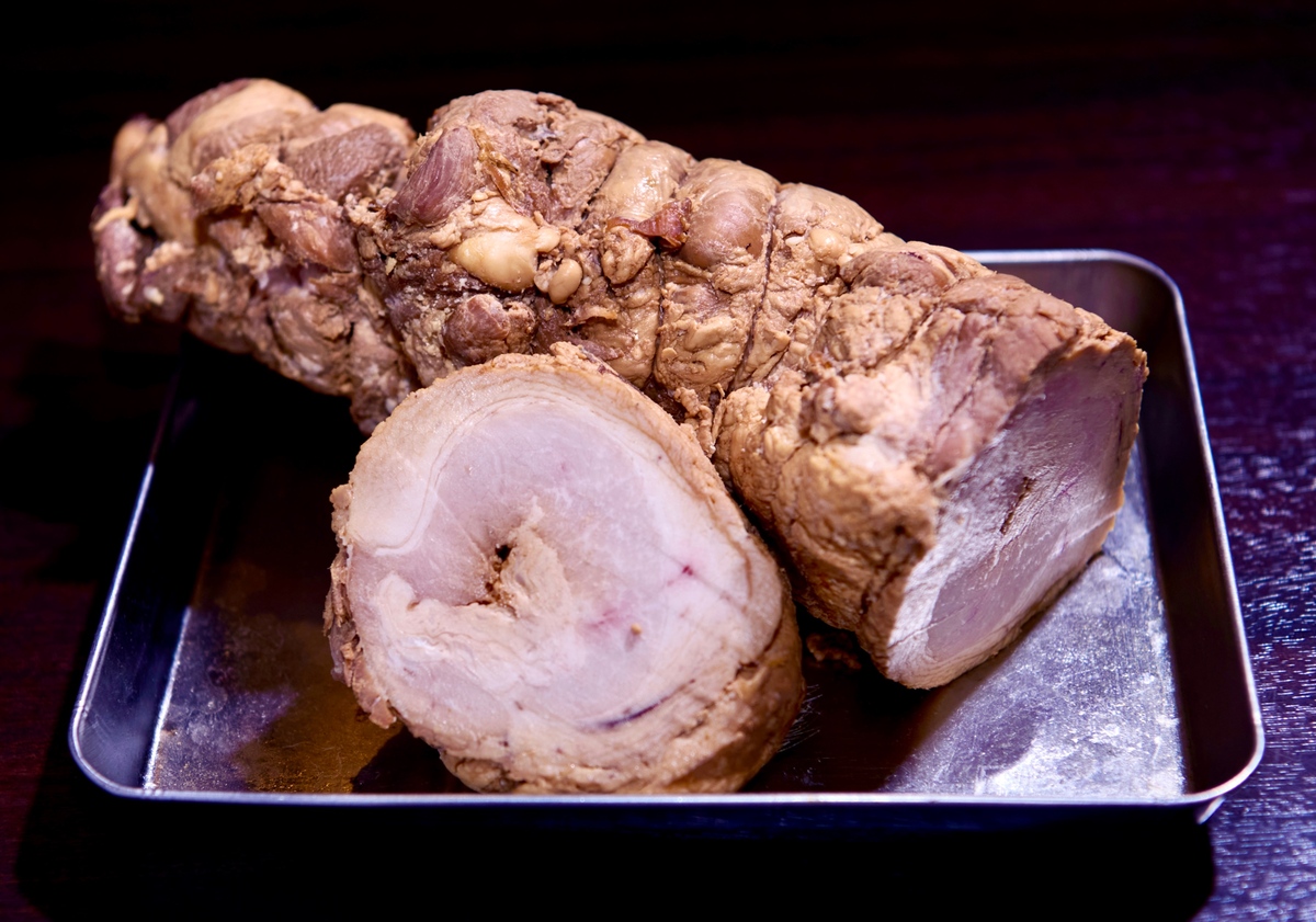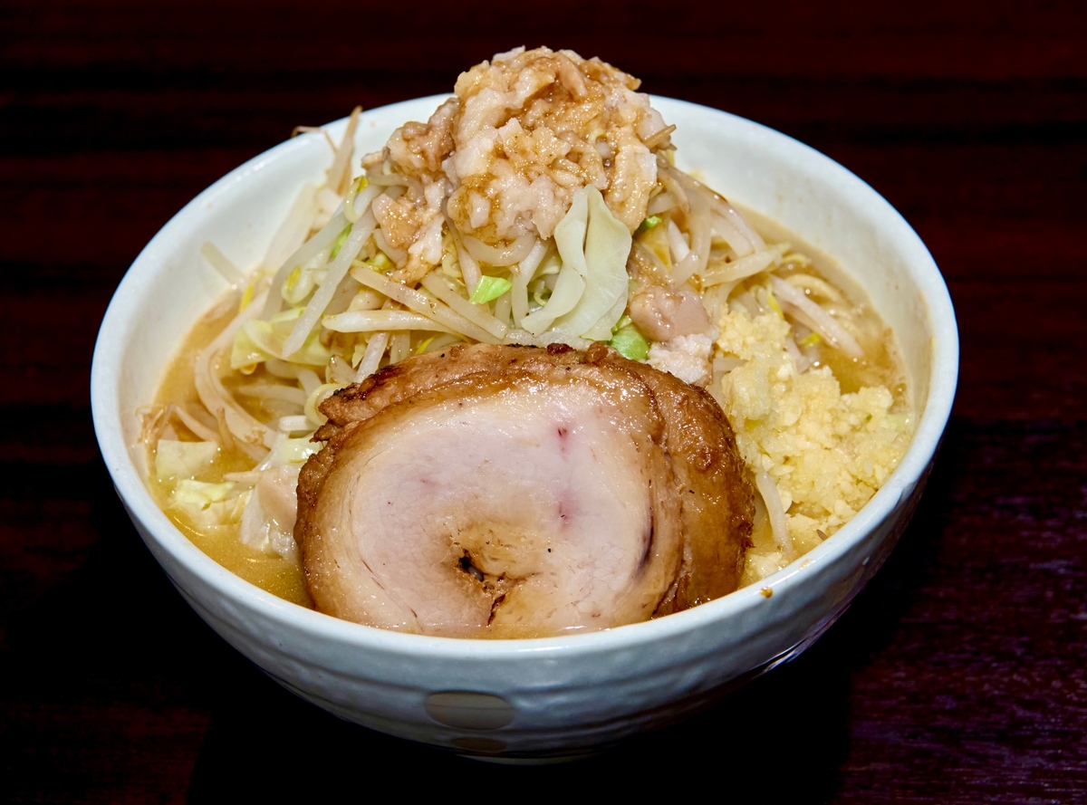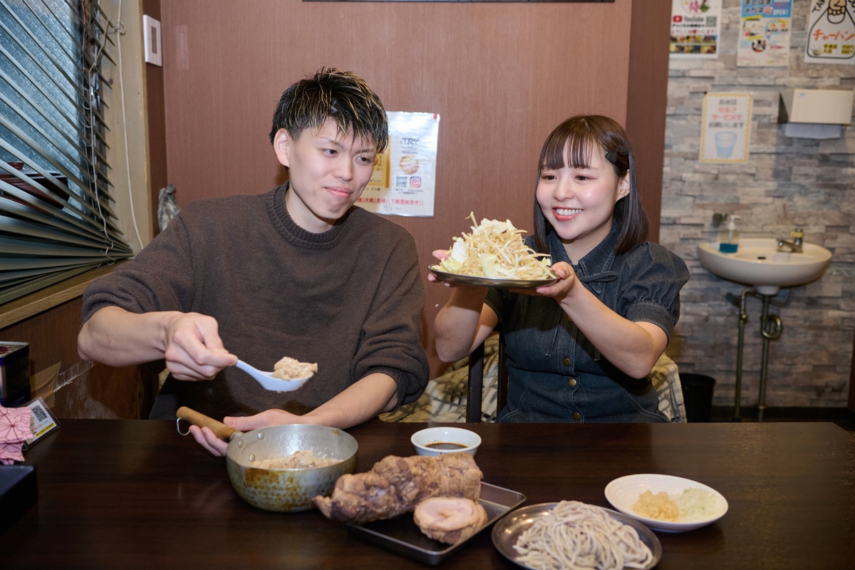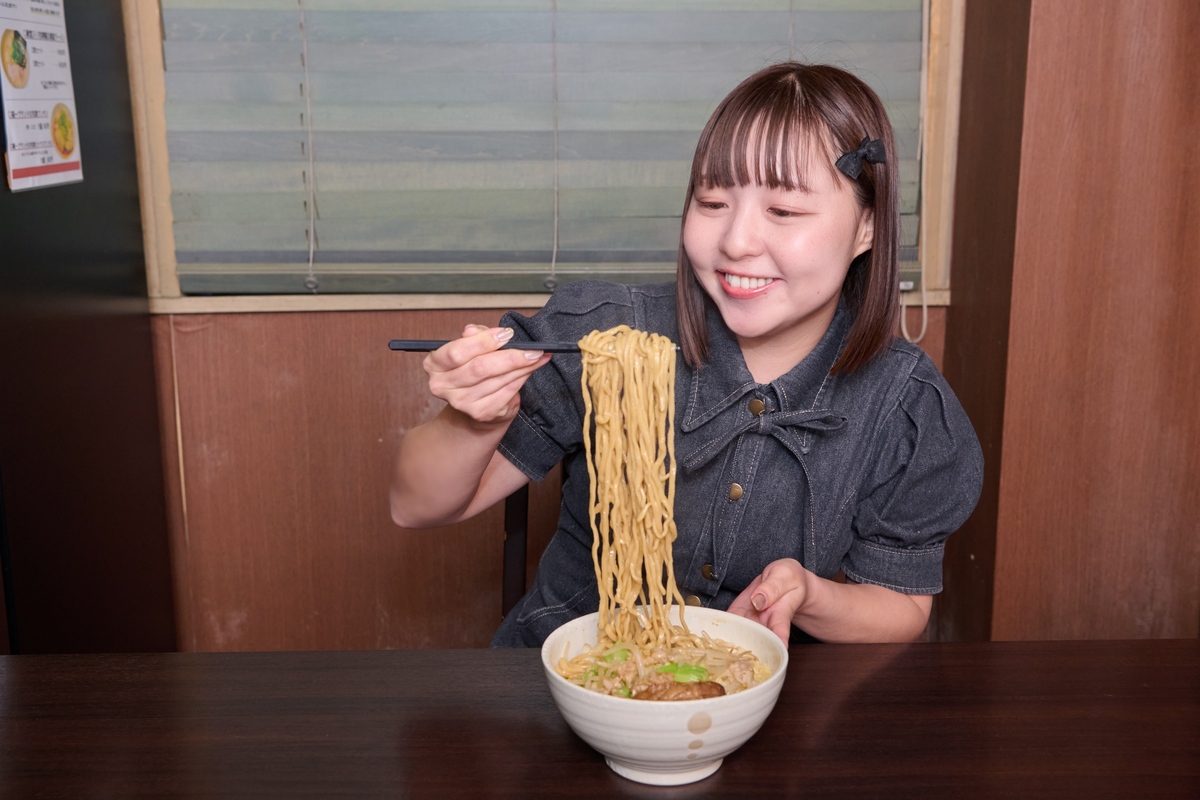「麺や 福一」は、千葉の銘柄豚「林SPFポーク」を一頭買いしているのもお店の特徴。「そのウデ肉をどーんとのせます! 肉質がみっちりでG系に合うはず」と石曽根店主。鶏清湯で煮た極厚チャーシューは、こんなに分厚くても歯応えは柔らか。試食したまーみんは、うれしそうに豚をかじって大満足の笑顔! もちろん、背脂も林SPFのものを贅沢に使用。甘味ある背脂が野菜の上にたっぷりふりかかっていて、味わいもビジュアルも濃厚な一杯に。