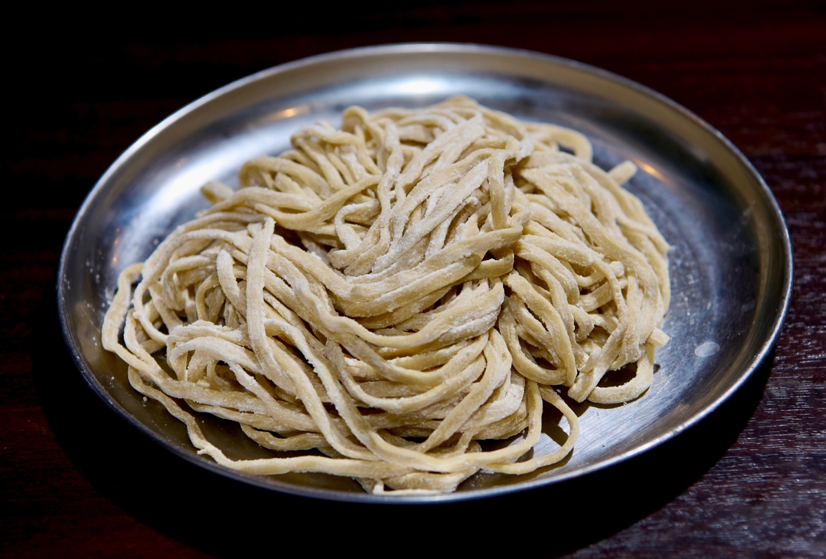 濃厚な鶏白湯+背脂たっぷりのG系スープと合わせる麺は、「G系といえば…のオーションの麺ではないのが意外でした」とまーみん。今回のスペシャル限定麺で使用するのは、「麺や 福一」の鶏白湯と長くマッチングしてきた麺屋棣鄂の麺なのだ。店主はこのメニューに合わせて、平打ち縮れ太麺を選択。「以前、限定で燕三条の背脂ラーメンを出した時に使った麺屋棣鄂の平打ち縮れ太麺が、うちの鶏白湯を使うG系には合うと思ったので」とその理由を語ってくれた。