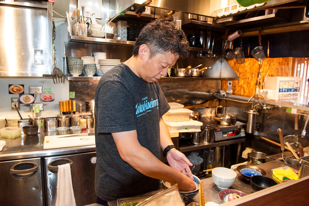 店主の吉川和寿さんは、和食やイタリアン、フレンチなど多彩なジャンルの飲食店を経験。また、食材の勉強のために市場で約10年間働いた経歴も。そして11年に埼玉の上尾に無国籍料理居酒屋「仙人のビストロ」をオープンして独立。その後にラーメンに魅力を感じ独学でラーメン作りをマスターし、14年に埼玉の上尾に「中華そば よしかわ」をオープン。素材の旨味を生かした中華そばは人気になり、多くのリピーターを生んだ。現在は姉妹店も含めると埼玉と東京で計8店舗を経営。「寿製麺 よしかわ 西台駅前店」は2018年11月にオープンした。
