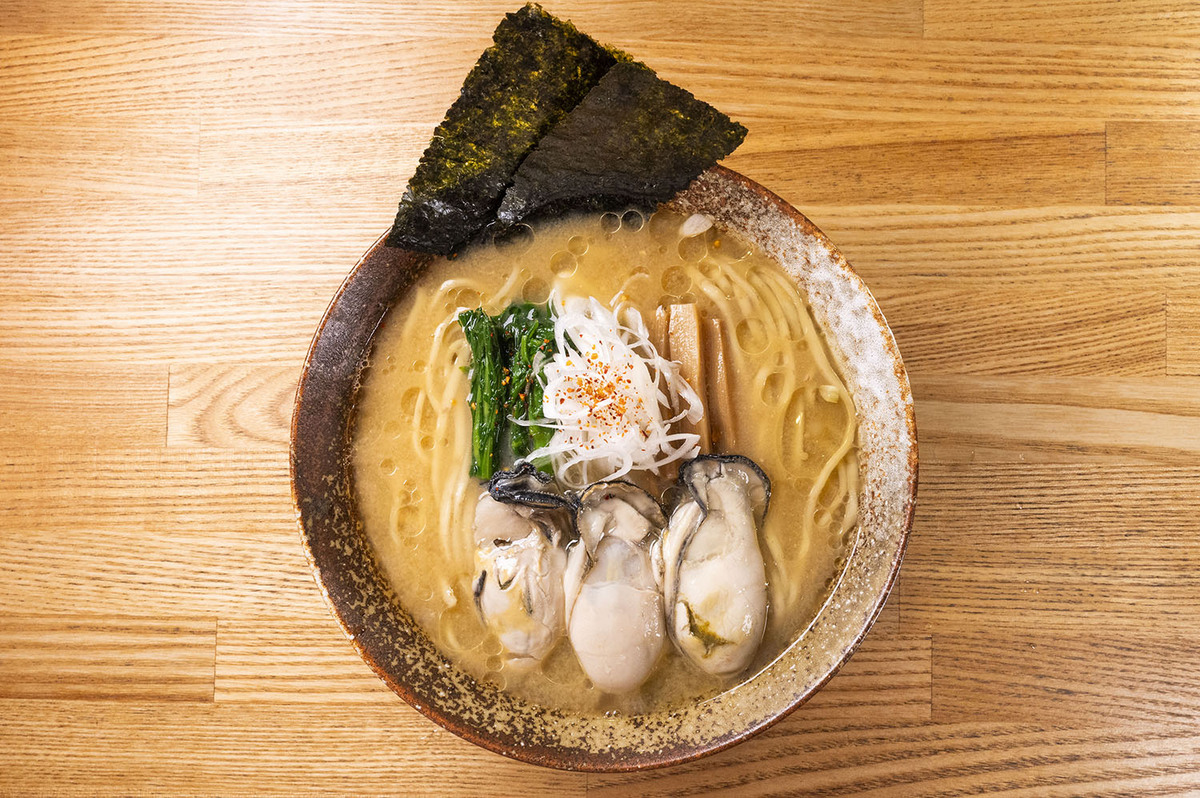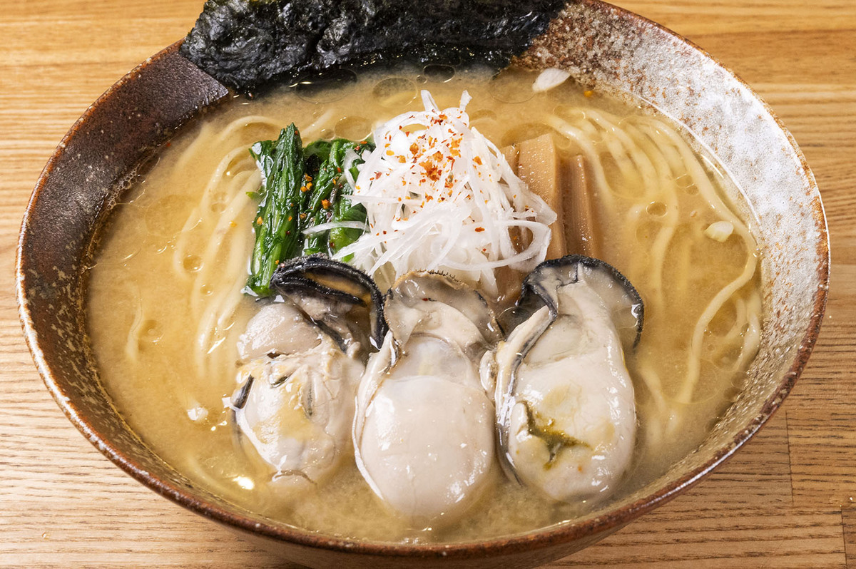 冬のこの時季が食べごろになる広島県産の生ガキを使用する。濃厚な旨味が特徴で、動物系の素材と合わせても負けない濃厚なスープになるほか、生ガキを贅沢にトッピングとしても使う。凝縮した旨味と生牡蠣のプリプリとした食感を味わえる。