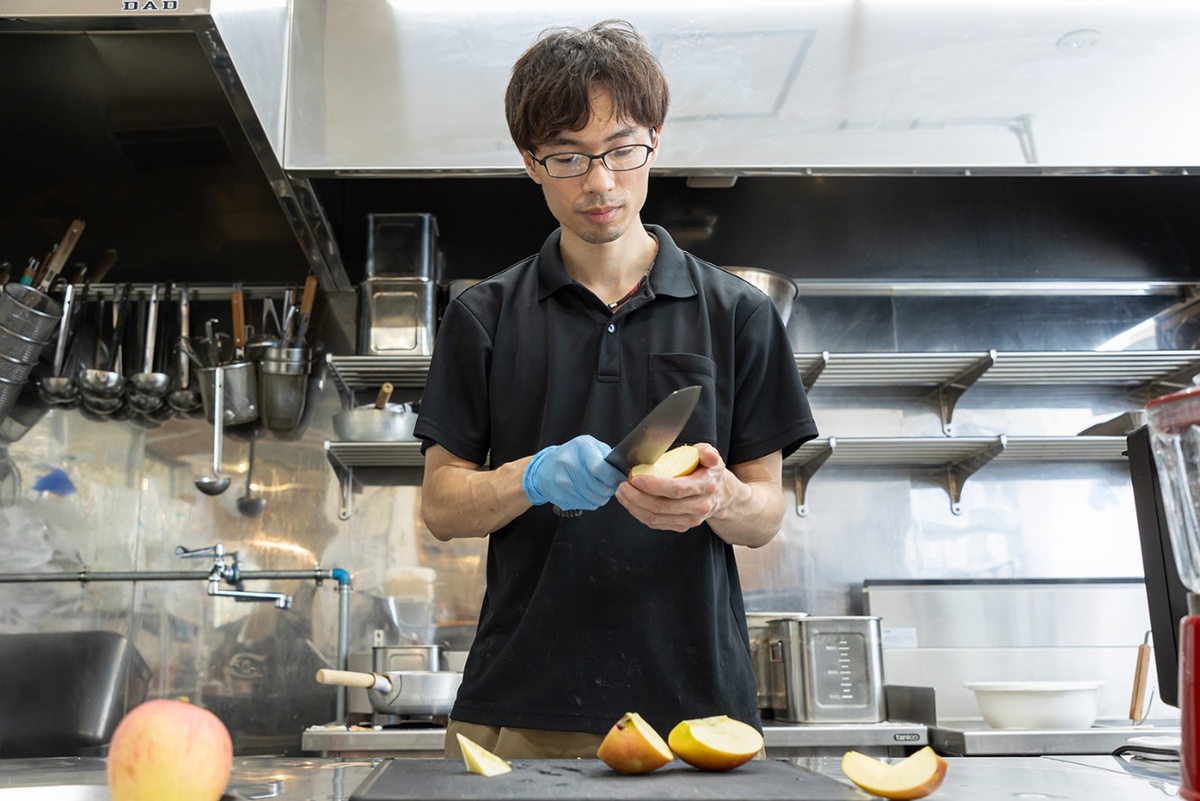 スープの仕込みでも、肉類と一緒にリンゴ1個を煮込んで隠し味に。具材も洋風にまとめ、自家製麺の上に盛るのはリンゴのバターソテーと、低温調理のフランス産豚肩ロースの薄切り。まるで生ハムのような肩ロース肉の塩気とリンゴの甘酸っぱさが絶妙なバランスだ。この機会に、店主・遠藤さんの遊び心がありつつ、緻密に計算されたつけ麺のフルコースを堪能しよう!