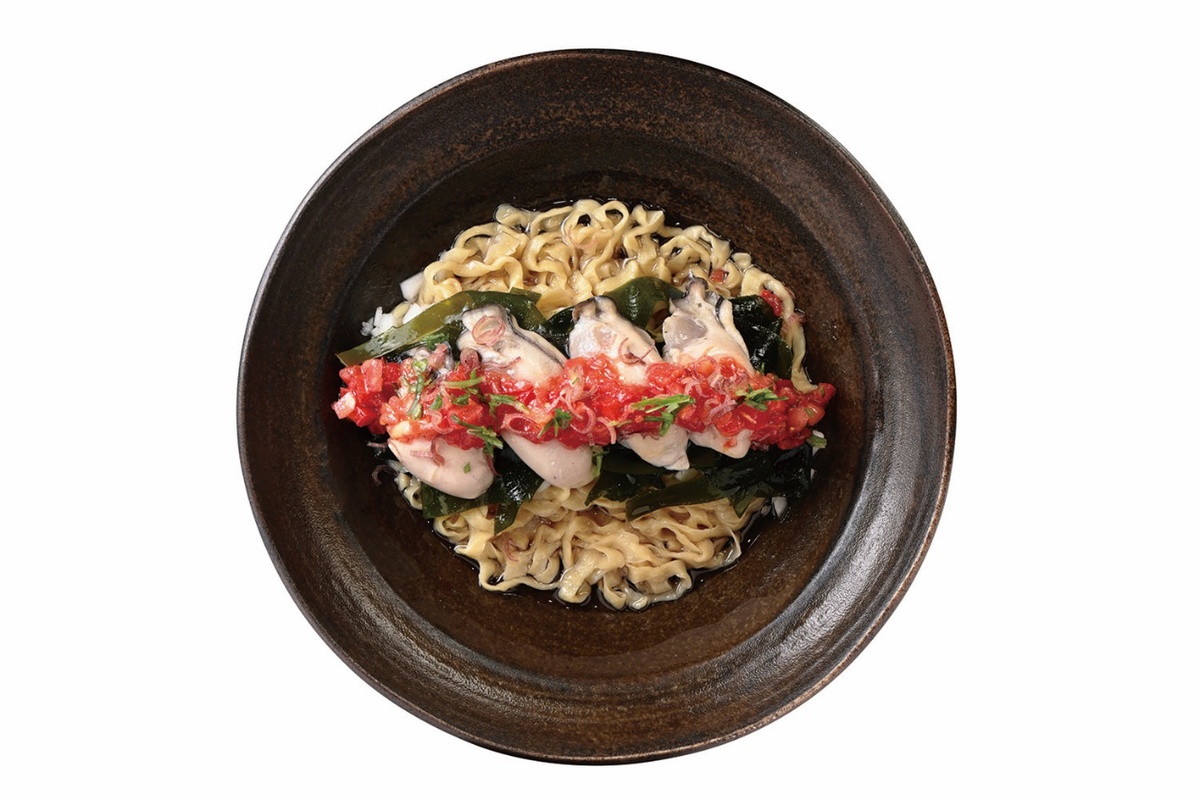 ブランドガキなどをトッピングする一杯は和えそばタイプ。塩ダレと自家製オイスターソースで絡めた和えそばがベースで、軽く湯通ししたカキ4個にトマトのマリネ、三陸生ワカメなどを添えた贅沢仕様だ。色鮮やかな野菜を用いた華やかな見た目も同店ならではのポイントだ!※開催日の夜営業は限定麺のみの販売になるので注意しよう。