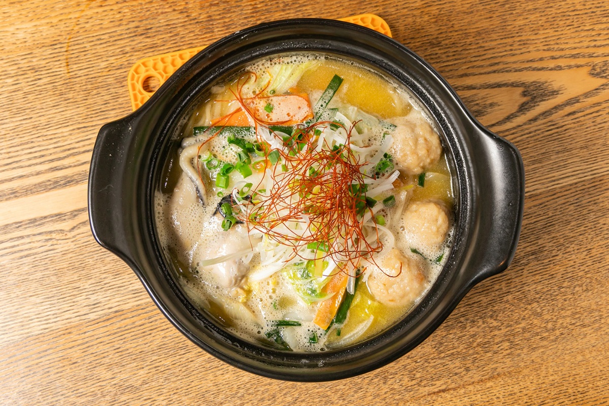 濃密な鶏白湯スープに自家製麺で人気を博す浦安にある「麺屋真星」が作る限定麺は、寒い冬にピッタリの鍋ラーメン。冬の味覚であるカキや白菜、ニンジン、ニラ、ネギなどを店自慢の濃厚な鶏白湯スープで煮込んだもの。カキや野菜の旨味も鶏白湯スープに溶け込んで、さらに奥深い味わいになること間違いなし。また、鍋に合うぞうすい(250円)も販売。ご飯、ネギ、岩海苔のセットで、具材を食べた後に鍋の中に入れて味わおう。ご飯が鶏白湯スープを吸って抜群のおいしさに。