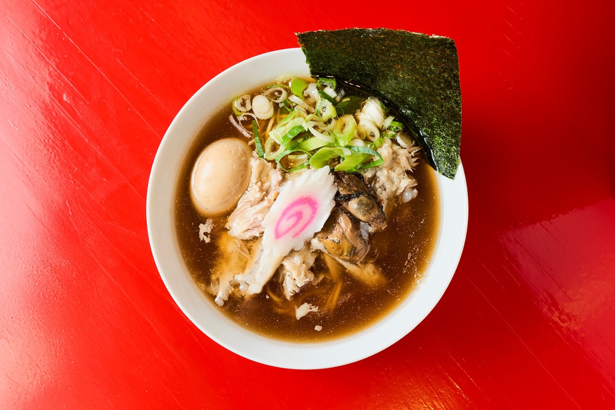 スープは東京の“ちゃん系”をイメージし、骨やガラではなく“豚肉”で取る肉系清湯スープ。「駒や」の豚骨ラーメン用の醤油ダレを合わせ、優しく自然な甘さを引き立てるザラメを隠し味でイン。具材には、牡蠣の醤油漬けや、一般的なチャーシューと異なる豚バラ軟骨、煮玉子、大判の海苔、懐かしさを演出する“の”の字のナルトを選んだ。魚介乾物の旨味も効かせた肉系スープと、しなやかなコシのある「博多製麺処」謹製の細ストレート麺がマッチする。