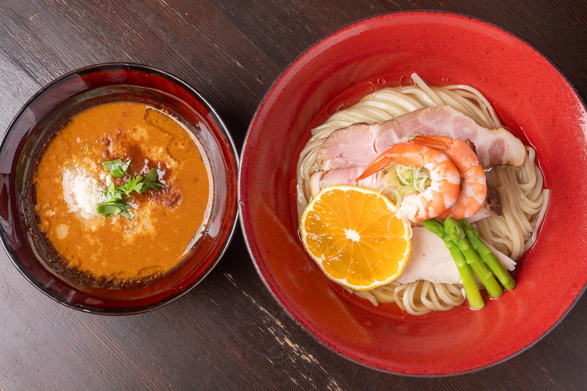 オマールエビなど複数種のエビを使用した限定つけ麺。つけだれは、焼いて粉砕した殻を豚骨白湯や野菜と炊き合わせて、複数回漉すことによって滑らかに。オイルにもエビを使用。味付けは白醤油を基本に、トマトの酸味で濃厚ながら爽やかに仕上げている。平打ち麺は提供時に和風の淡麗エビ出汁に浸され、そのままでも楽しめて、エビを存分に堪能できる一杯。