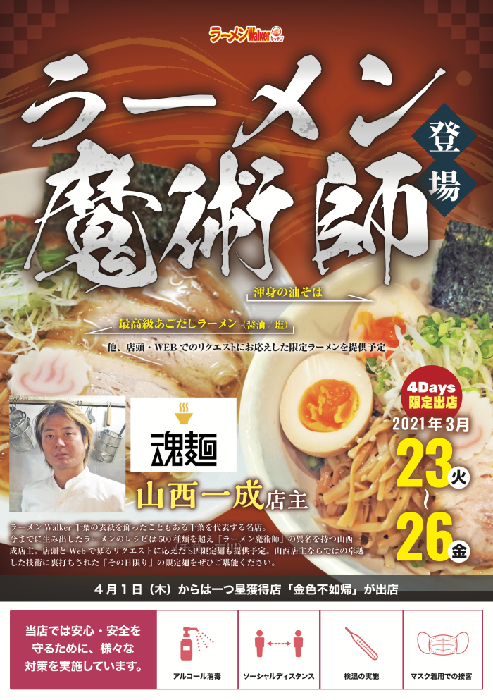 ラーメンWalker千葉の表紙を飾ったこともある千葉を代表する名店。「ラーメン魔術師」の異名を持ち、今までに生み出したラーメンのレシピは500種類を超える。今回は長崎県平戸市の最高級焼きあごを使用したあごだしラーメンと大人気メニューの油そばをメインに提供。さらに、店頭とWebで募ったリクエストに応えて作るSP限定麺も登場。卓越した技術に裏打ちされた「その日限り」の限定麺をぜひご堪能ください。