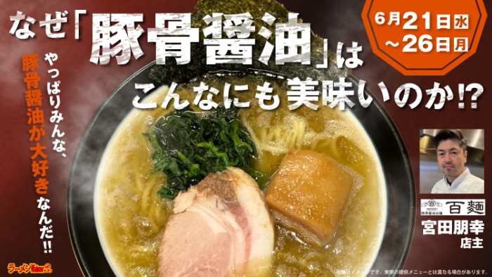 「豚骨醤油」と言われて、きっとラーメンファンなら日本各地の様々なラーメンが思い浮かぶはず。 それだけ「豚骨」と「醤油」は抜群の愛称で、日本各地でその土地ならではの「豚骨醤油」が愛され続けています。 今回、そんな「豚骨醤油」の魅力を改めて全身で感じていただきたく、最高の豚骨と、最高の醤油が折り重なって生み出される一杯をご用意して、皆様をお待ちしています。 Googleカレンダーにこの予定を追加する。