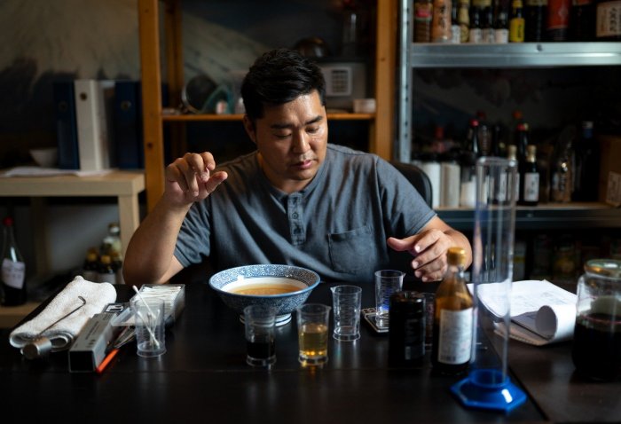 八木晧平さん。今年立ち上げた試作室『Kitchen R Labo』にて、ラーメンに向き合い日々研究を重ねている。