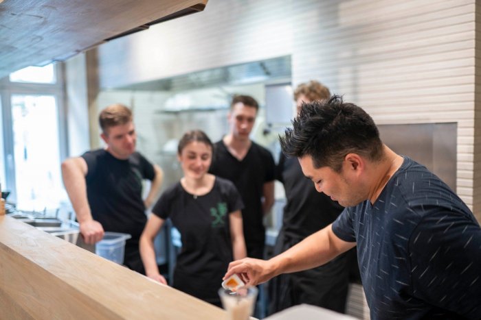 まだないです。けど僕、レストランの顔としてあまり出たくないんですよ。僕がラーメンを考案していますが、毎日頑張っているのはスタッフですから。“これを作っている子がすごいんですよ”って伝えてあげたい。本当に感謝しています。僕がこういう思いで作ったとか、細かなオペレーションの受け取り方が違うこともありますけど、いまこういう立場になって、協力してくれる方がいて本当に嬉しい。それこそ一緒にやっているビジネスパートナー(松木 平氏)ともよく話すんですが、一緒に働く人たちをハッピーにしたい。やっぱり働いている人をハッピーにして、その人の希望をかなえてあげられる環境を整えるのがいちばんいいかなと。まずスタッフがハッピーにならないとお客さんもハッピーにできないじゃないですか。なので、スタッフとも、これから何をしていきたいかや将来の夢に向けて手伝えないかなども聞くようにしています。